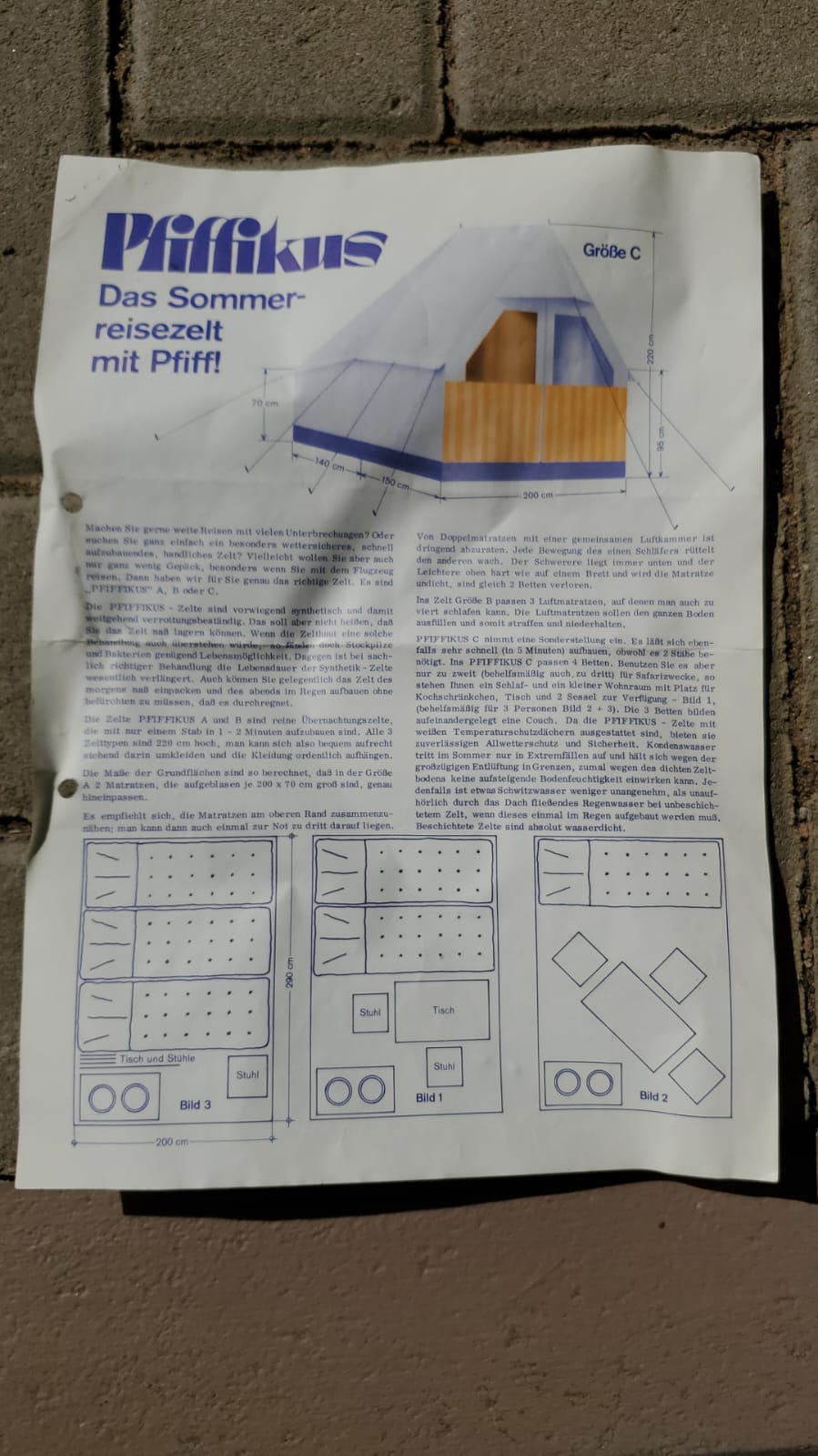 Beide Zelte haben natürlich Gebrauchsspuren und scheinen bis auf ein paar Abspannleinen und die Heringe vollständig zu sein. Sie wurden in einem geheizten Abstellraum gelagert und sind deswegen trocken, aber etwas staubig. Für das Vollschutzzelt Comfort existieren sogar noch die original Aufbauanleitungen, sodass dabei nichts schiefgehen kann.