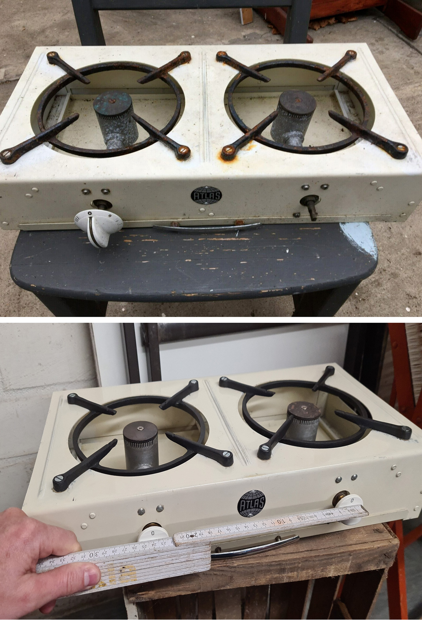 Ich habe in der letzten Zeit Gefallen an alten Gaskochern gefunden. So habe ich mir nacheinander zwei Kocher von GaWa Typ Atlas gekauft, die ich unter beibehaltung der Alters- und Gebrauchsspuren aufgehübscht und auf einen technisch benutzbaren und betriebssicheren Zustand gebracht habe. So habe ich sie z.B. komplett in alle Einzelteile zerlegt, jedes einzelne Teil gereinigt, poiliert, lackiert oder ersetzt. Auch die Brenner, Brennerdüsen, Gasröhrchen, Gasschläuche und so weiter.