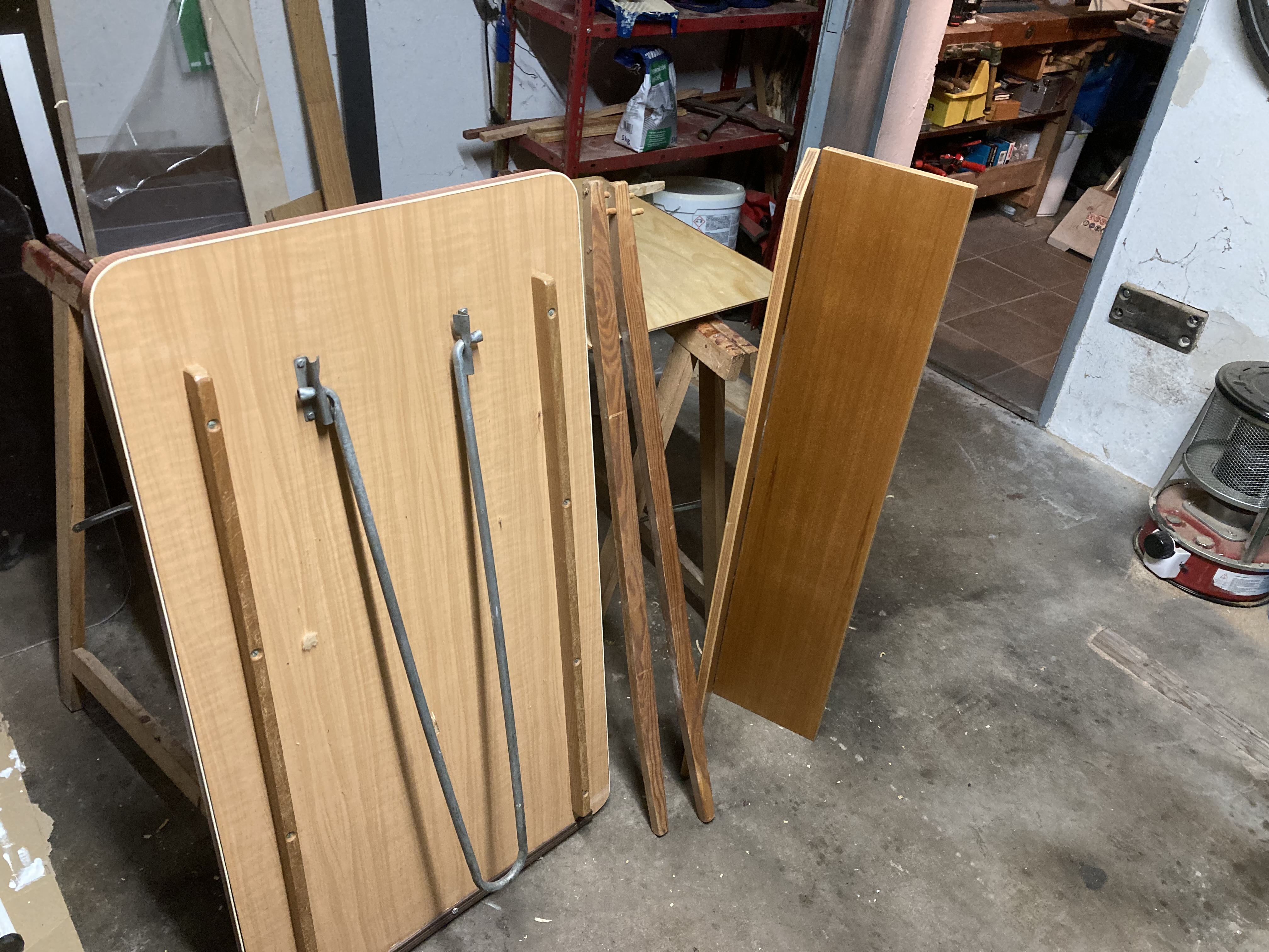 Unten der Tisch,zwei Latten die von Sitzbank zu Sitzbank gelegt wurden um der Liegefläche Stabilität zu verleihen und rechts daneben eine Platte mit Scharnier in der Mitte zum auseinander oder zusammen klappen