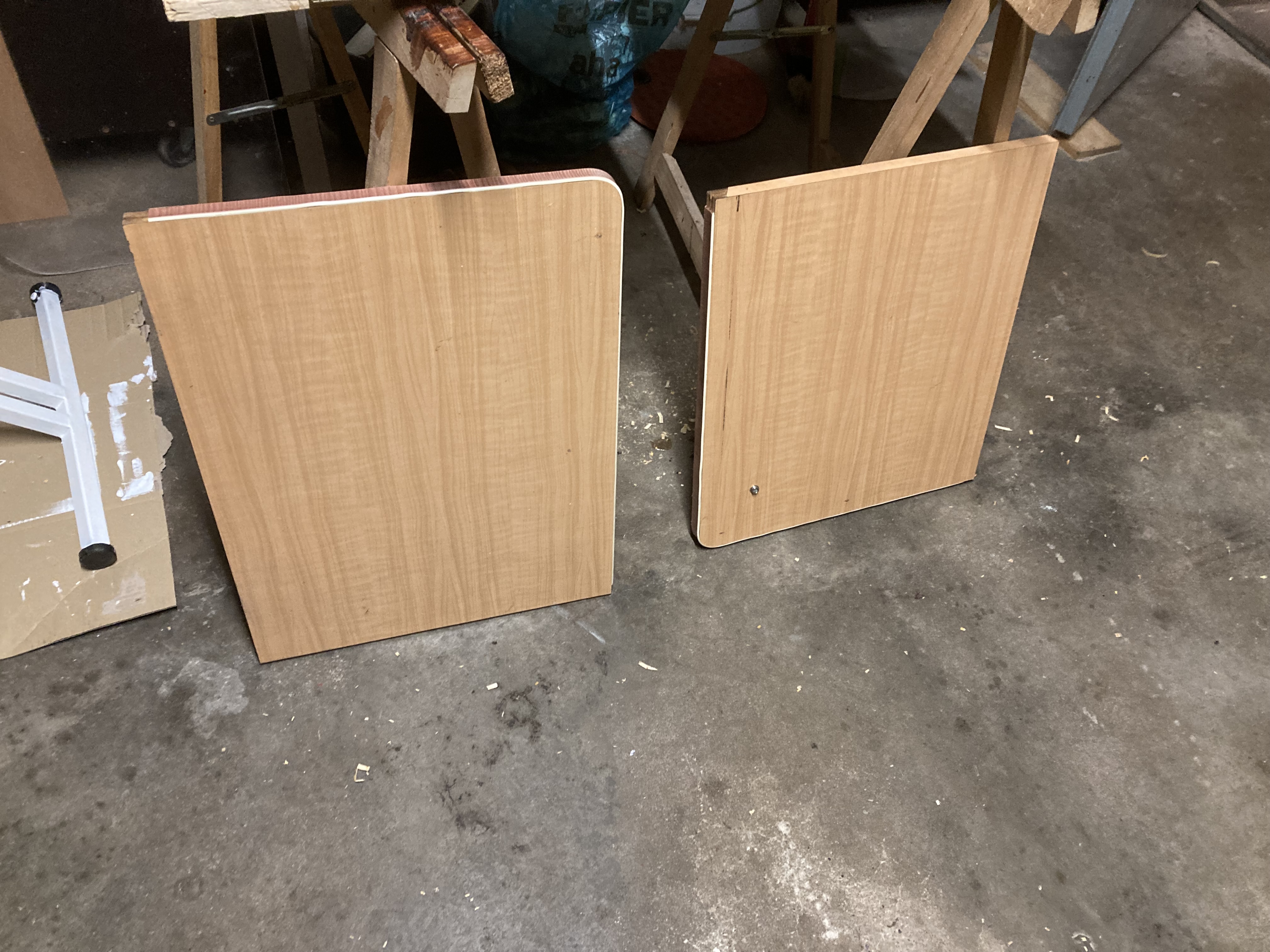 Oben Abdeckplatten für den Herd und das Waschbecken (seitliches Furnier an einigen Stellen Schadhaft)